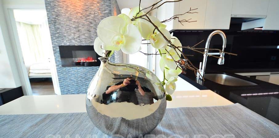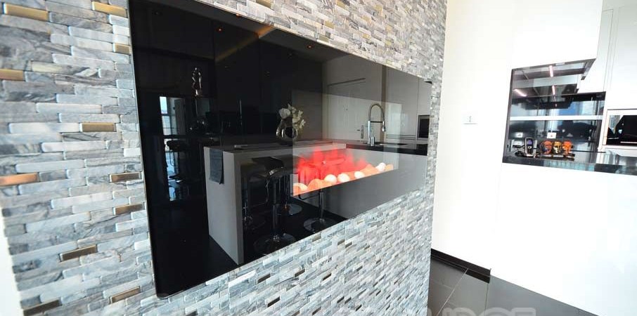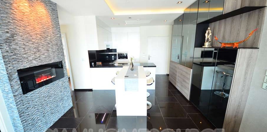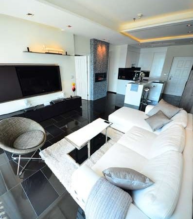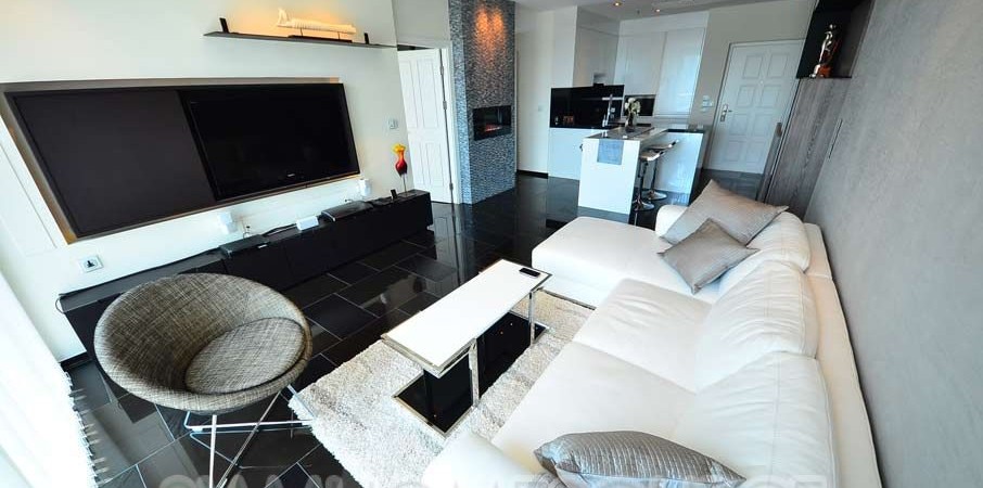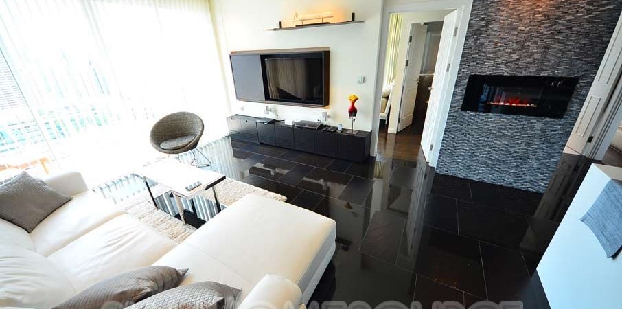 This masterfully furnished and decorated 2 bedroom, 2 bathroom unit features 83 square meters of lavish living space. The condo is decadently furnished and includes high class decor such as an electric LED fireplace imported from Sweden. The condo also has a unique (only unit in the condo w/ this balcony) spacious wrap-around balcony with fabulous unblocked city views.