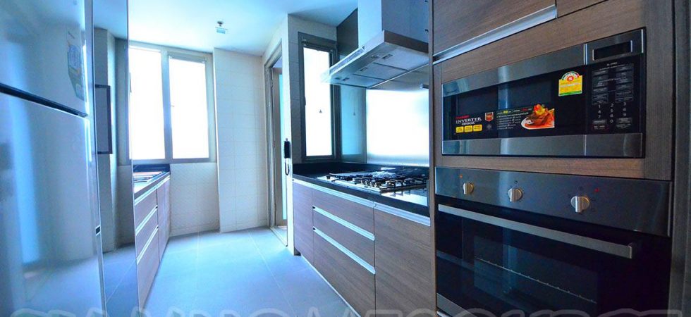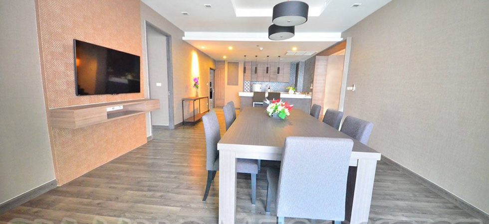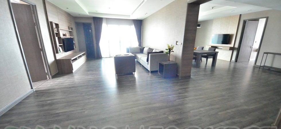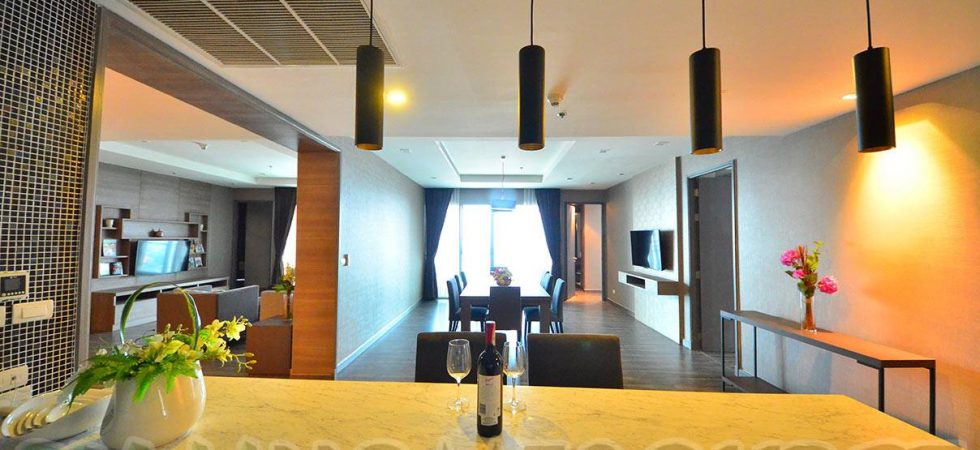 Perfect for executives and their families, this 4 bedroom sub penthouse is a luxurious accommodation in a quality residential highrise. The 370 square meter sub penthouse is nicely furnished and very well equipped including having a large flat screen LED television in the living room and mounted flat screen LED televisions in all 4 bedrooms as well as the dining room. There is a small balcony with fantastic unblocked city views from this 39th floor apartment. Inside there is a bar area adjacent to the dining room and a separate, nicely equipped Western kitchen. This executive sub penthouse has two maid’s rooms with a full sized laundry area.